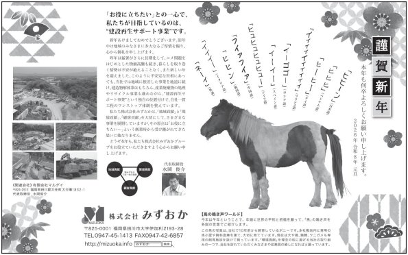 新春挨拶の新聞広告を今年も元日に出稿しました。掲載誌は『毎日新聞』2026年1月1日発行の筑豊版で、紙面は約半ページの全7段枠に掲載。地域のみなさまへの感謝の気持ちと、新春の新たな決意を込めた年賀広告で、昨年に引き続き干支の動物を取り上げたオリジナルの原稿です。毎年お楽しみいただけるようにと願って制作しており、当サイトにも原稿データを掲載していますので、ぜひご覧ください。